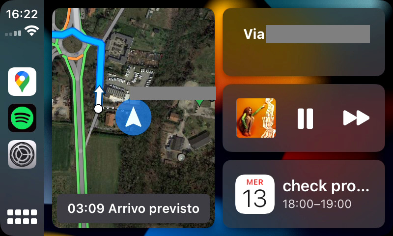 La barra di stato verticale di CarPlay mostra diverse informazioni utili come l’orologio, lo stato delle connessioni Wi-Fi e mobile (livello segnale e tipo rete – es.: 4G/5G) e della batteria (livello e carica in corso).