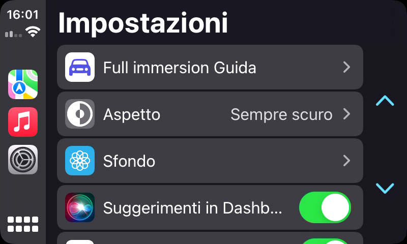 Sempre dalle impostazioni di CarPlay potete modificare l’aspetto (chiaro, scuro o automatico notte/giorno), mostrare o nascondere i suggerimenti nella Dashboard e le cover dei brani musicali (illustrazioni album), abilitare la Full Immersion Guida per concentrarvi sulla strada limitando o silenziando le notifiche e i messaggi.