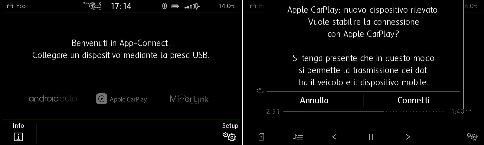 Prima di accedere a CarPlay alcune vetture richiedono la conferma di connessione (es.: tocco su finestra CarPlay) e l’attivazione della trasmissione dati dall’iPhone.
