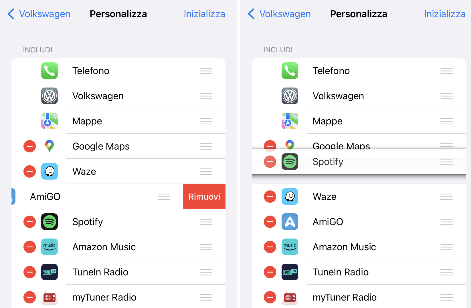 Potete aggiungere, rimuovere o organizzare l’ordine delle app tramite le impostazioni di CarPlay sul vostro iPhone (Impostazioni > Generali > CarPlay > Personalizza) cliccando su “+” (aggiungi), “–“ (elimina) o toccando e trascinando le app elencate una per volta.
