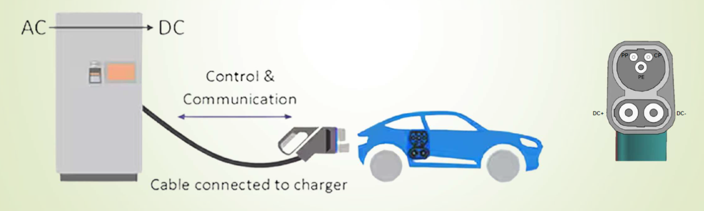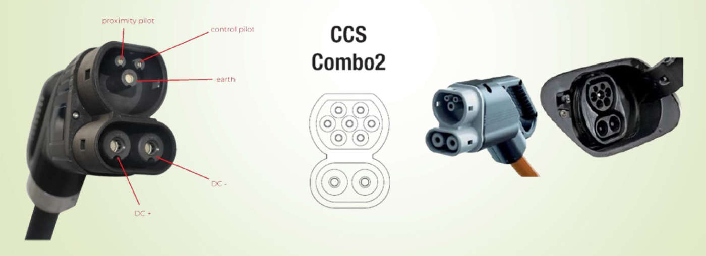 La pistola CCS Combo 2 è lo standard europeo per la ricarica DC dalla colonnina e mantiene la parte superiore della pistola Tipo 2 (terminali femmina Proximity Pilot, Control Pilot e terra) senza i conduttori delle tre fasi AC. Nella ricarica DC i terminali PP/CP vengono utilizzati in una comunicazione simile al CAN-bus.