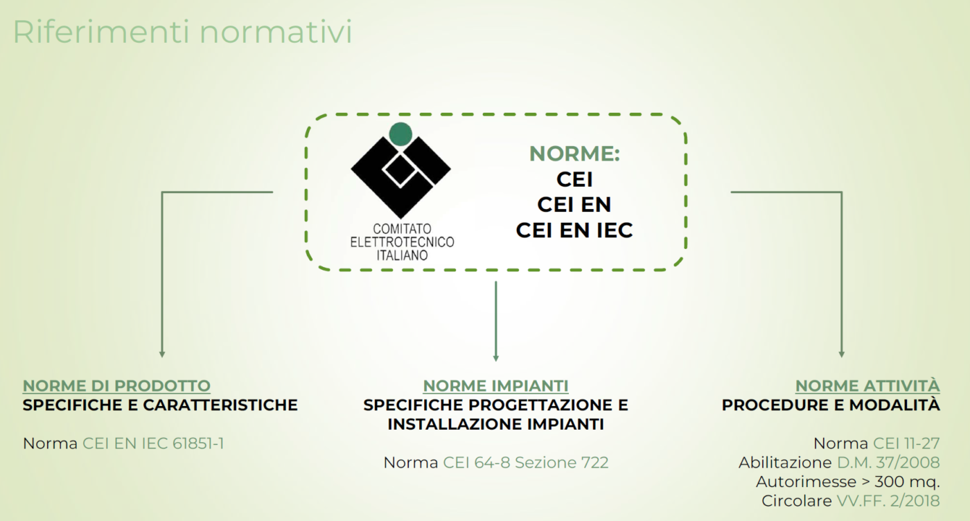 La Norma CEI 64-8/7 – sezione 722 – richiede la presenza di un circuito dedicato con apposito sezionatore e protezione differenziale di tipo A o B con corrente differenziale nominale di intervento non superiore a 30 mA. Se la Wallbox viene installata in luoghi esterni è richiesto un grado di protezione uguale o superiore a IP44.