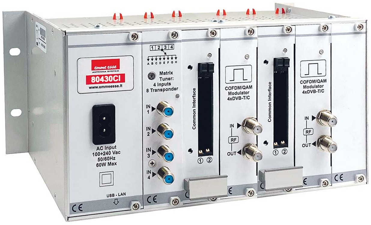 Il transmodulatore trasforma un tipo di modulazione in un’altra. Negli impianti satellitari effettua la conversione della modulazione originaria DVB-S/S2 (QPSK o 8PSK) in DVB-T/T2 (QPSK o QAM) per la ricezione su qualsiasi televisore con tuner terrestre e senza bisogno di decoder SAT, smart card, CAM, ecc.