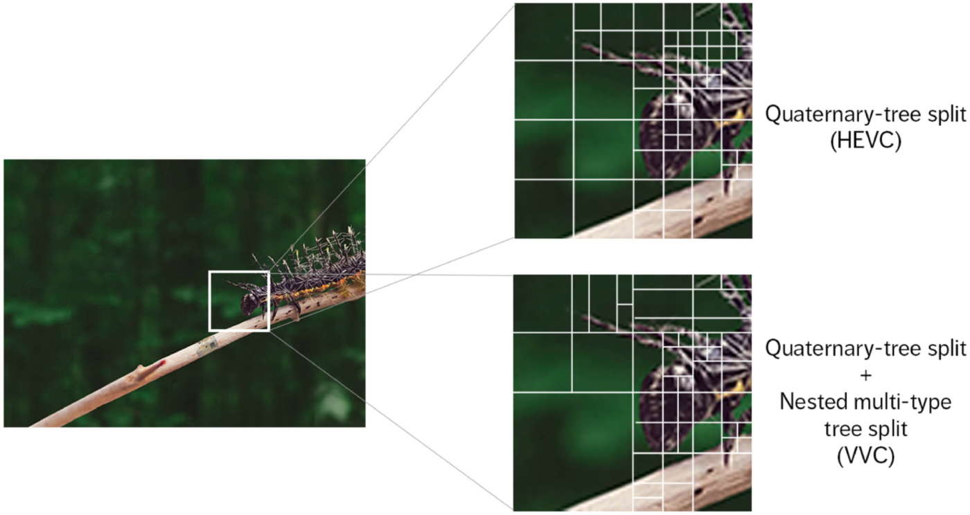 I blocchi di grandi dimensioni migliorano l’efficienza di codifica di aree “piatte” come gli sfondi, in particolare per i video ad alta risoluzione (dall’HD in su). Per rappresentare in modo efficiente aree altamente dettagliate come trame e bordi, invece, VVC utilizza uno schema di partizionamento flessibile in grado di partizionare CTU da 128×128 pixel fino a unità di codifica (CU) di soli 4×4 pixel (8×8 pixel in HEVC) così da ottenere una precisione più elevata.