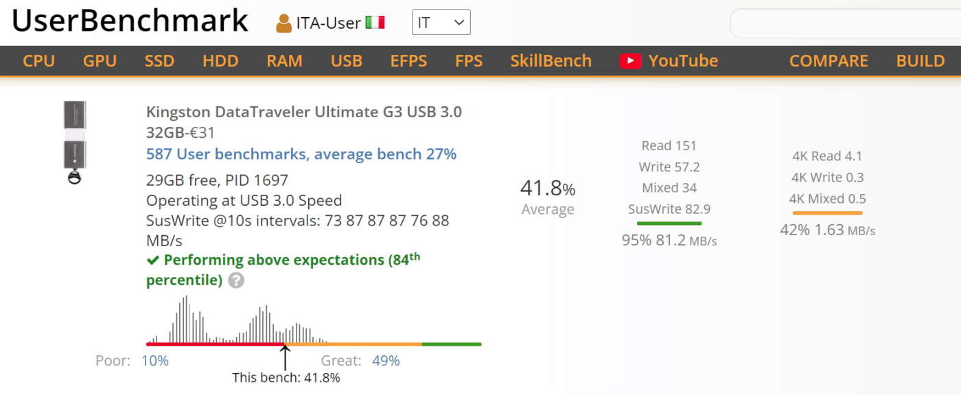 Al di là del brand e della questione “fake”, l’unico modo per verificare le reali prestazioni di una chiavetta USB è utilizzare gli appositi programmi per PC come UserBenchmark (il sito elenca anche migliaia di chiavette già testate dagli stessi utenti) e USBDeview.