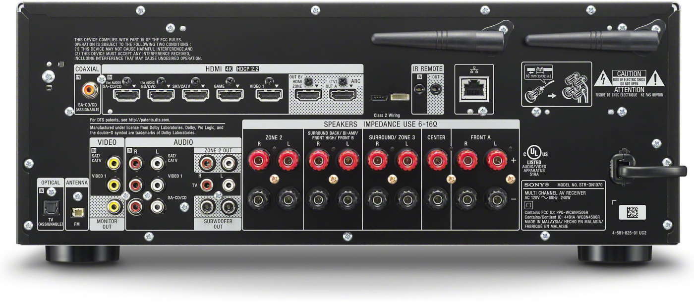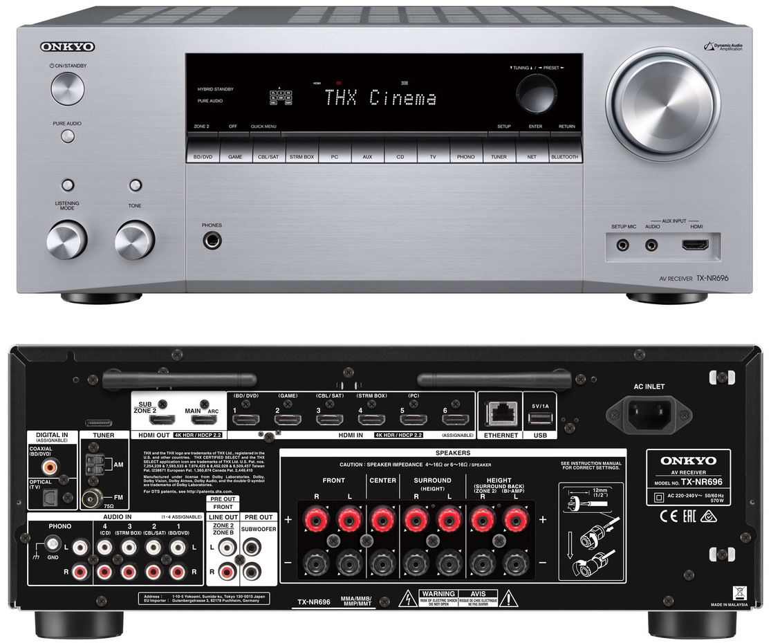 Sono presenti ben 9 prese HDMI 2.0 (4K@60Hz, HDRR10, Dolby Vision, ARC) di cui 2 uscite per altrettanti display (es.: Tv in salotto e in camera da letto), 12 tra ingressi e uscite audio (analogiche, digitali, cuffia, subwoofer e giradischi) con vari DSP (games – rock, sports, action, RPG, movies, music, Vocal Enhancer, ecc.).