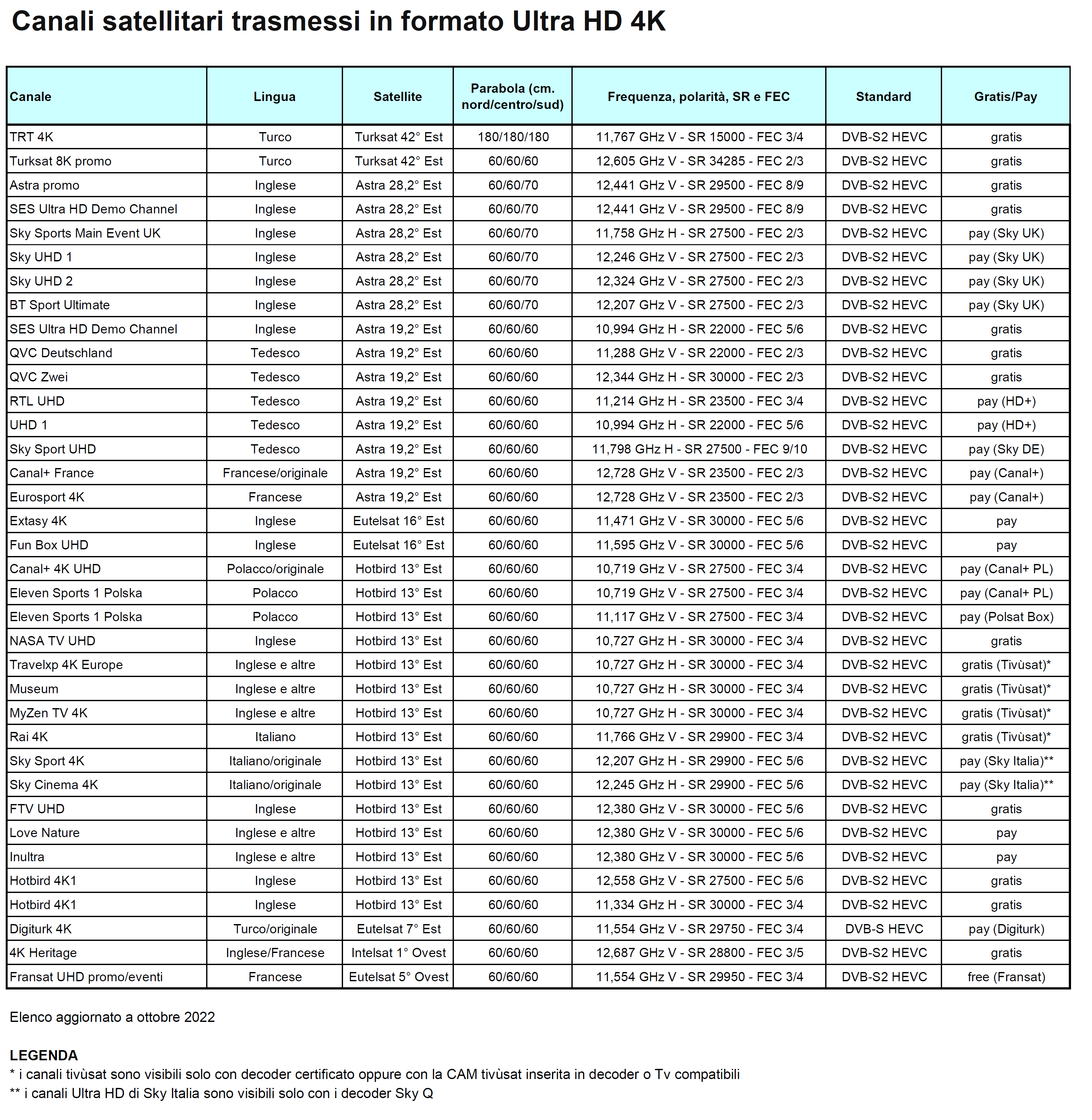 Sui principali satelliti in orbita sulla Fascia di Clarke e visibili anche in Italia sono presenti decine di canali Ultra HD 4K che trasmettono in chiaro (free-to-air) e che sono visibili gratuitamente, senza CAM né smart card.