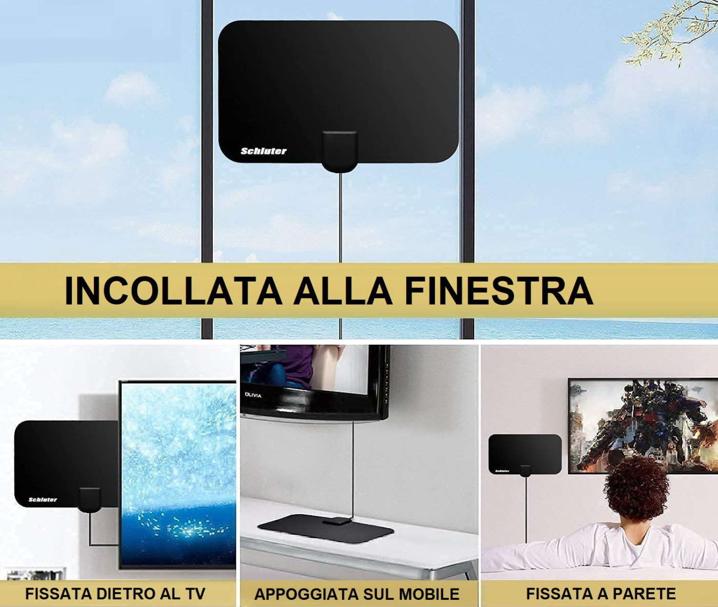 L’antenna portatile da interno si può posizionare ovunque: sul mobile Tv (anche dietro al televisore – vedi FAQ sotto), su una mensola, fissata a parete o incollata al vetro della finestra. L’importante è che si trovi nelle vicinanze del televisore o del decoder (il cavo antenna ha una lunghezza limitata) e che ci sia una presa di corrente nelle vicinanze.