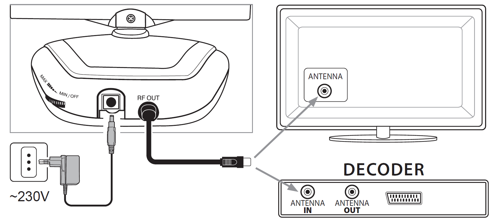Alcune antenne possono essere alimentate direttamente da Tv o decoder, utilizzando la tensione che scorre all’interno del cavo coassiale d’antenna. In tal caso non serve l’alimentatore in dotazione ma bisogna ricordarsi di abilitare nel menu OSD del Tv/decoder l’opzione “antenna attiva” (ON).