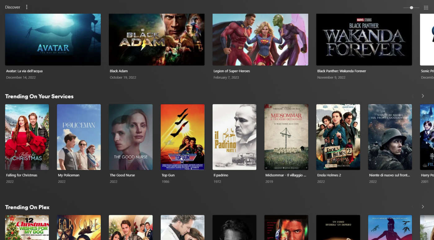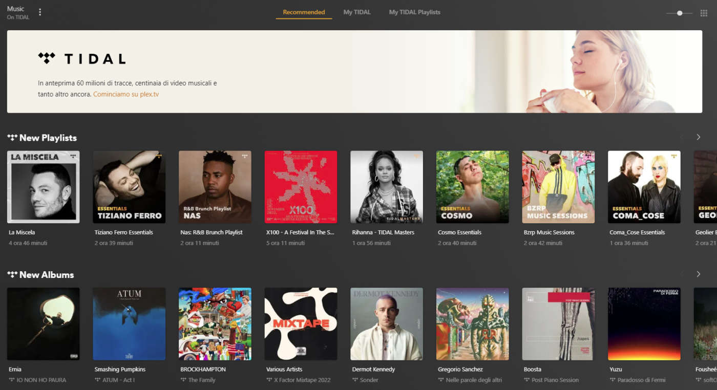 Troviamo poi la sezione Discover, con anteprime, trailer, teaser e il motore di ricerca per film e serie Tv trasmessi dai servizi VOD a cui siete abbonati (Netflix, Prime Video, Apple TV, Disney+, ecc.), e l’accesso completo all’offerta musicale di Tidal (solo con Plex Pass).