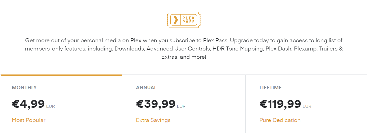 In alternativa è possibile acquistare il Plex Pass (4,99 euro/mensili, 39,99 euro/annuali o 119,99 euro/una-tantum), valido per l’utilizzo su tutti i dispositivi sotto lo stesso account, che aggiunge diverse funzioni interessanti come trailer, interviste e dietro le quinte dei vostri film e show televisivi, i testi delle vostre canzoni da LyricFind, la conversione HDR-SDR Tone Mapping, la transcodifica hardware audio/video, l’accesso alle app Plex Labs e molto altro.