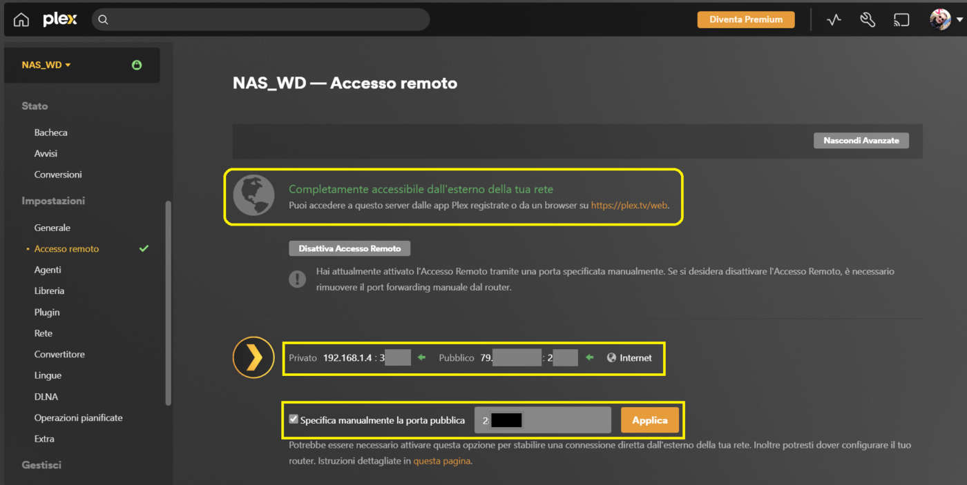 Basta accedere alle impostazioni del server Plex (anche da web), abilitare l’accesso remoto, “aprire” le porte del modem/router (solo se necessario – vedi qui le istruzioni), modificare la porta di ingresso e/o uscita (sempre se necessario – vedi configurazione del modem/router) e testare la connessione.
