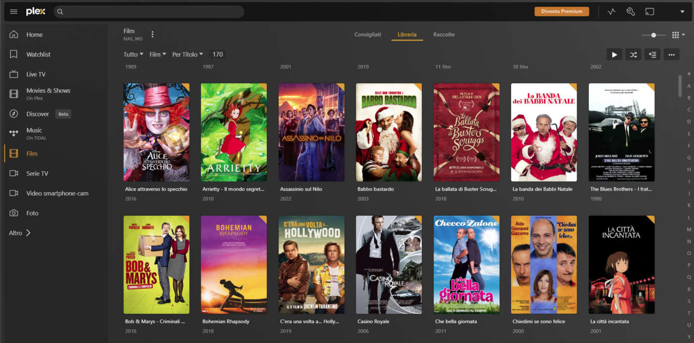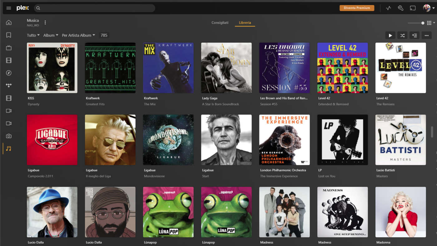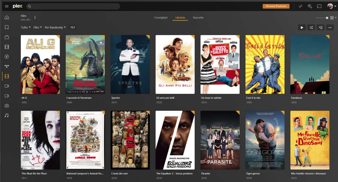 Completata la scansione, Plex cercherà nei suoi database i metadati necessari ad “arricchire” i vostri file (cover album, locandine e schede di film, nomi di musicisti, registi, attori, ecc.) e mostrerà i contenuti nella schermata principale in base alla sezione selezionata a sinistra (es.: Film, Musica, Foto, Video, ecc.).