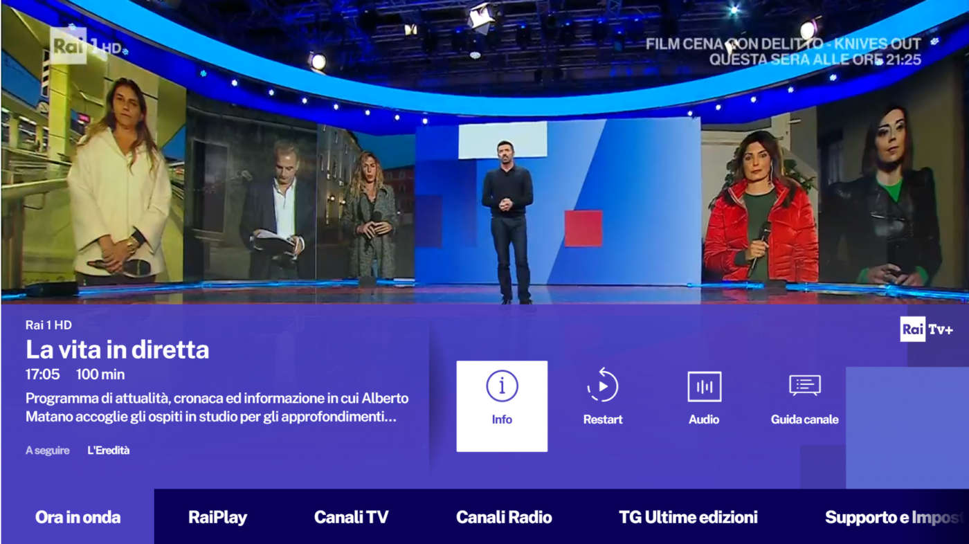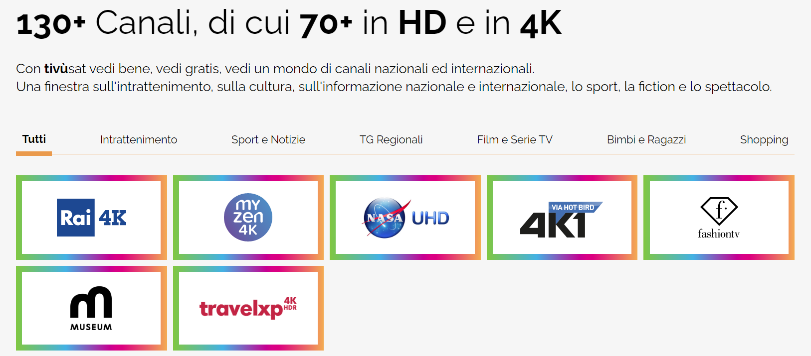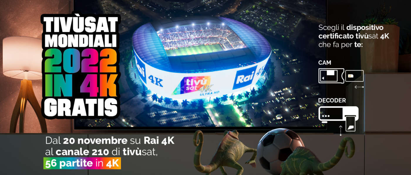 Per quanto riguarda i canali televisivi “tradizionali” (live streaming “lineare”), ricordiamo che tivùsat propone via satellite centinaia di canali italiani e internazionali di cui alcuni in 4K, visibili con una parabola da 60-80 cm puntata sui satelliti Hotbird 13° Est, un Tv 4K con tuner satellitare e CAM tivùsat 4K o con decoder esterno (clicca qui per tutti i dettagli).