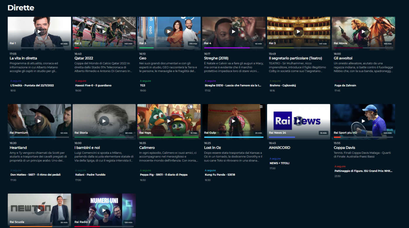 RaiPlay trasmette però in live streaming tutti i canali del digitale terrestre in qualità HD (es.: Rai 1-2-3-4-5, Rai YoYo, Rai Gulp, ecc.) e tutte le partite del Mondiale FIFA 2022 ma non in 4K.