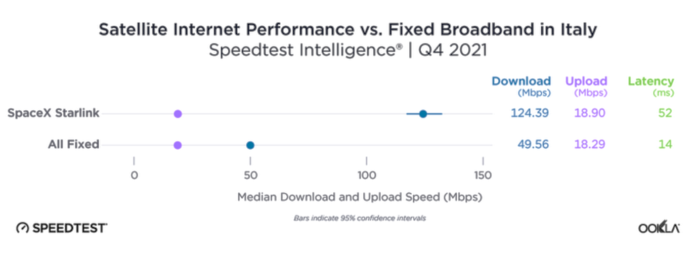 Si tratta di valori molto buoni se confrontati con altre connessioni satellitari (decisamente più lente) ma pur sempre inferiori alle prestazioni delle reti fisse FTTH e FTTC 200 Mbps.