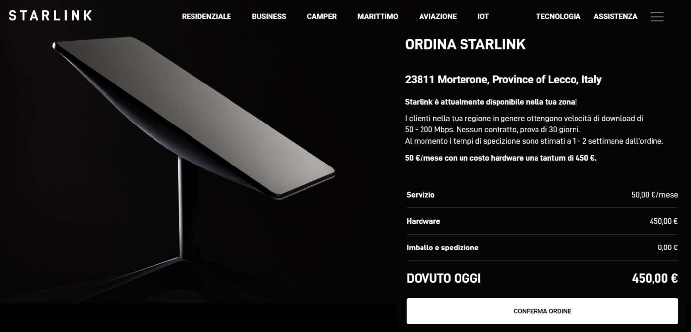 Il piano di abbonamento Residenziale di Starlink abbinato al kit Standard costa 50 euro al mese e prevede il solo accesso a internet (no voce) con una velocità tipica di 20-100 Mbps (download) e 5-15 Mbps (upload).