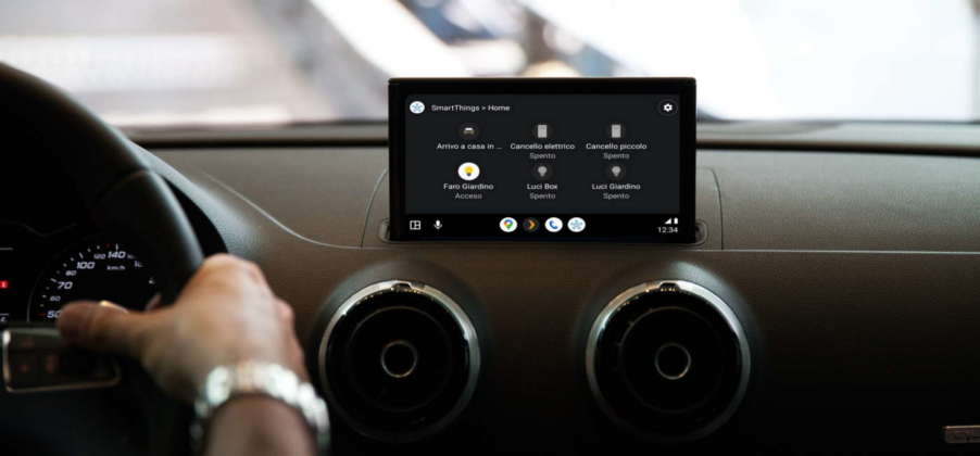 Sì. È possibile usare i comandi vocali Alexa, Google e Siri (tramite smartphone, Echo Auto, Android Auto, CarPlay, ecc.), la app proprietaria se compatibile con Android Auto e/o CarPlay (es.: Shelly Cloud) oppure la app SmartThings (solo su Android Auto).