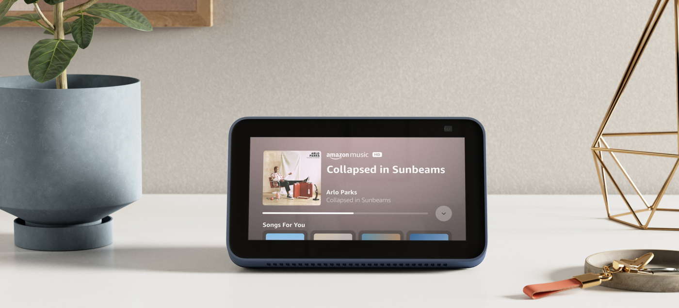 Il nuovo Echo Show 5 di terza generazione (2023) è uno smart display compatto, versatile ed economico, perfetto come radiosveglia multifunzione e monitor per baby CAM in camera da letto oppure come orologio, timer e promemoria per la cucina.