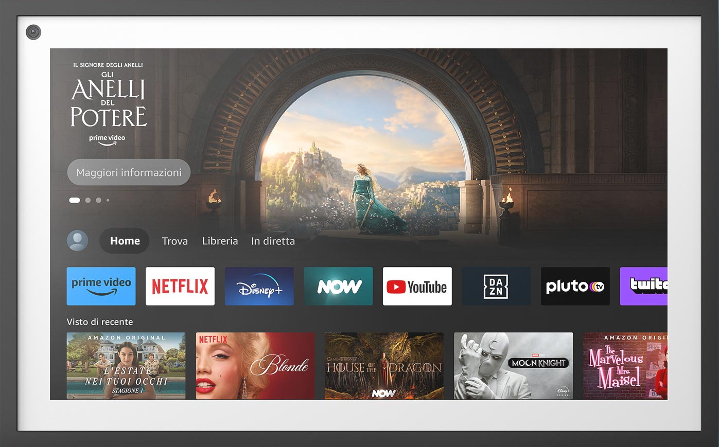 L’ampio schermo è ideale anche per foto, film, serie Tv e canali televisivi (supporta anche il telecomando Alexa di terza generazione), per le videochiamate (con telecamera fissa da 5 megapixel), per la visione di telecamere di sicurezza, videocitofoni e baby CAM, a tutto schermo oppure in una mini finestra (Picture-in-Picture) insieme ad altre informazioni e contenuti (orologio, meteo, news, widget, ecc.).