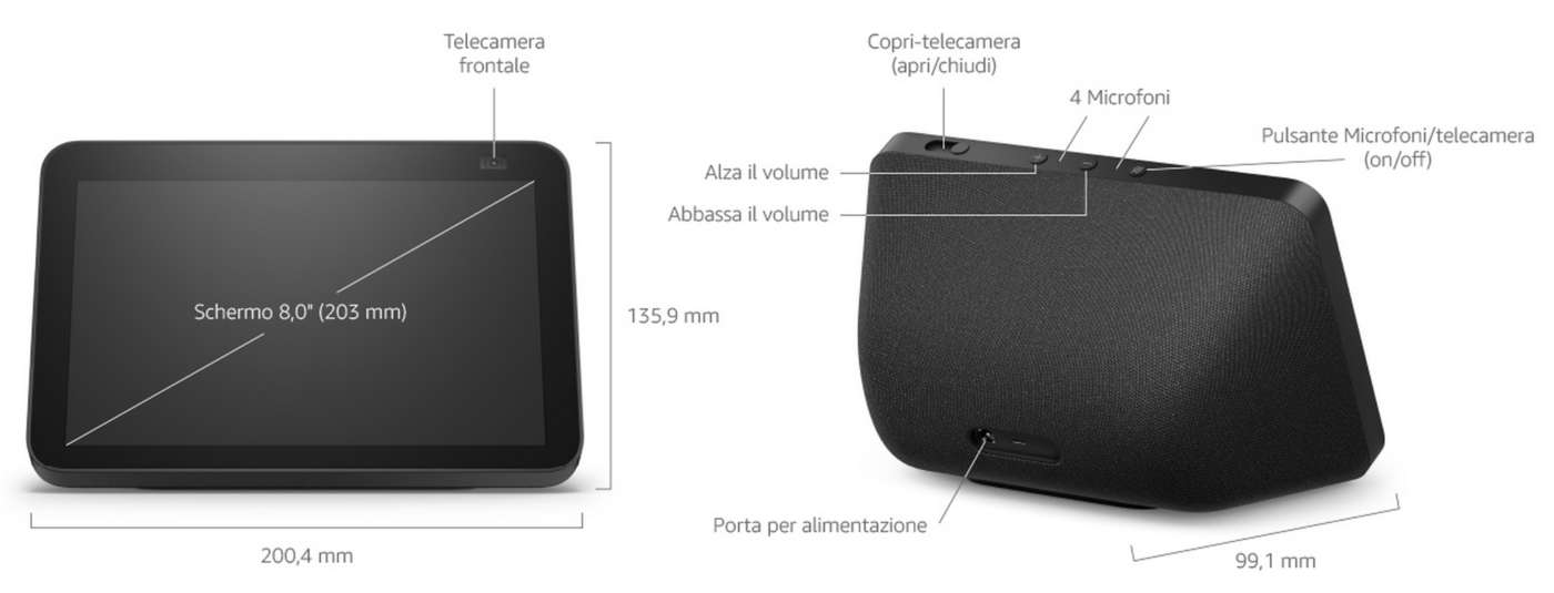 A seconda del modello il display ha una diagonale di 5,5 pollici (Echo Show 5 di 2a/3a generazione), 8 pollici (Echo Show 8), 10,1 pollici (Echo Show 10) o, addirittura, di 15,6 pollici (Echo Show 15).