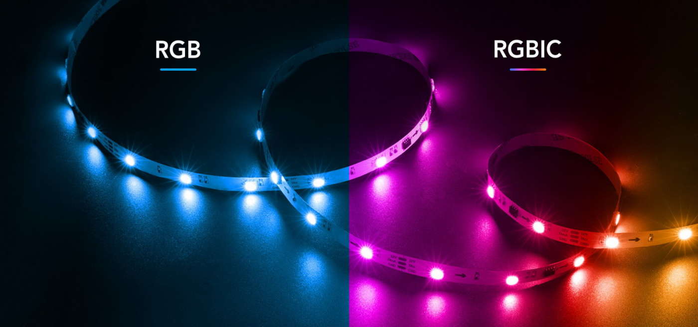 Esistono anche strip led con tecnologia RGB-IC che generano colori diversi simultaneamente: una porzione (o il singolo led) può illuminarsi di rosso, un’altra di verde, un’altra ancora di blu e così via, generando una colorazione segmentata ideale come effetto ambienza.