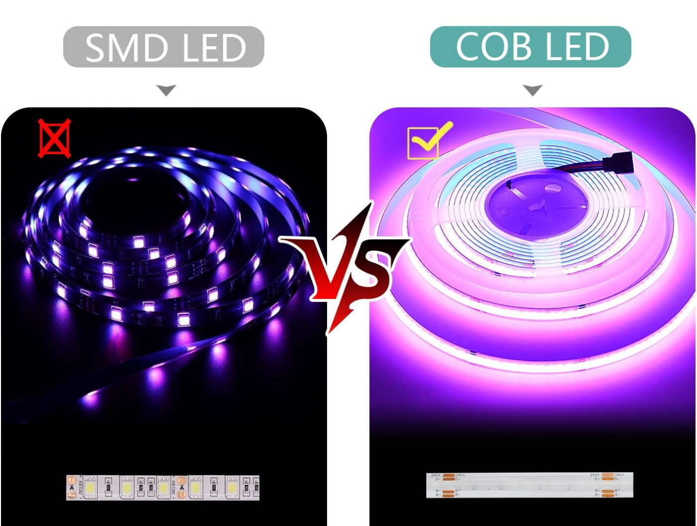 Le strisce led RGB smart di ultima generazione utilizzano chip di tipo COB (Chip On Board) invece che SMD con un elevato numero di led ed una lente ottica che diffonde meglio la luce, sia bianca che colorata, così da eliminare il fastidioso “effetto puntinato” dei singoli led distanziati.