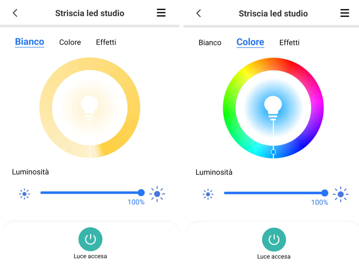La app permette di accendere e spegnere la striscia led con un semplice tocco dello schermo, aumentare o diminuire la luminosità, scegliere il colore desiderato attraverso la palette che appare sullo schermo e/o la temperatura colore (tonalità di bianco – caldo, naturale, freddo).