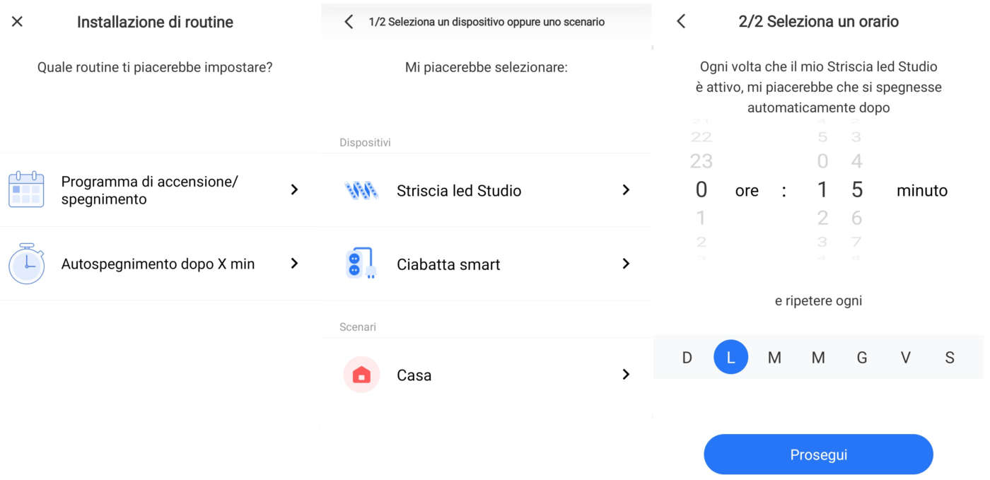 Tutte le app permettono anche di accendere e spegnere la striscia led smart in modo automatico programmando il timer (es.: accesa alle ore 23.00 e spenta alle 7.00), il conto alla rovescia (es.: spegnimento dopo 20 minuti per far addormentare il bambino) o creando varie automazioni intelligenti (es.: luce accesa al tramonto e spenta all’alba oppure luce accesa di colore rosso quando qualcuno suona al citofono, quando il sensore magnetico rileva l’apertura di una porta/finestra, ecc. (vedi qui e qui).