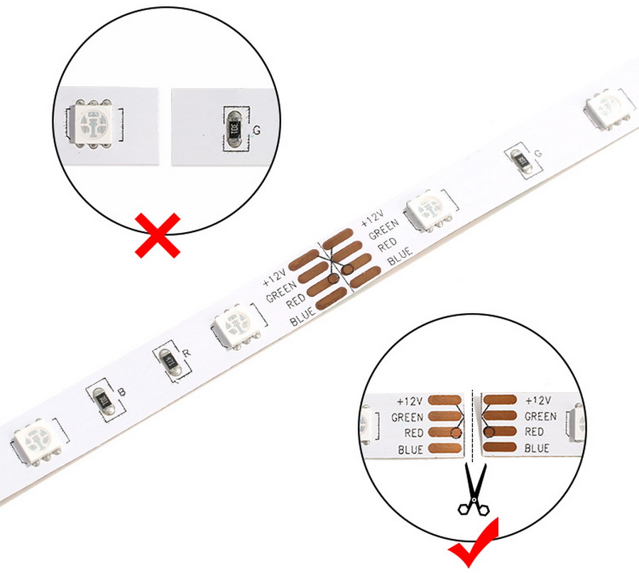Anche se a prima vista il chip COB è continuo, cioè senza interruzioni, è possibile sezionare la strip tagliandola nei punti indicati esattamente come nei chip led singoli.