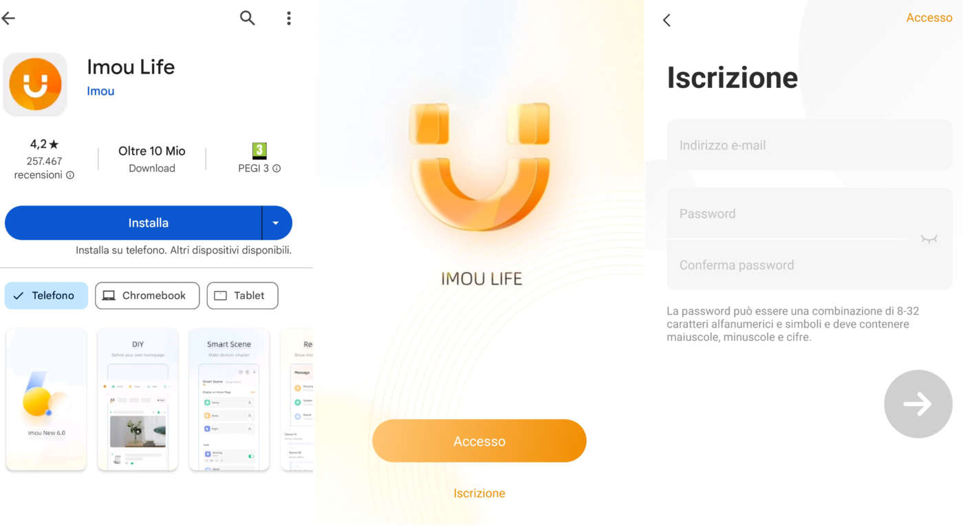 Il collegamento e la configurazione iniziale della telecamera IP sono operazioni veloci e alla portata di tutti. Basta collegarla all’alimentatore in dotazione, solitamente con cavo USB, Micro-USB o USB-C, scaricare sullo smartphone l’applicazione suggerita dal produttore (es.: Tapo, Tuya, Imou Life, Ezviz, ecc.) e creare un account (username e password).