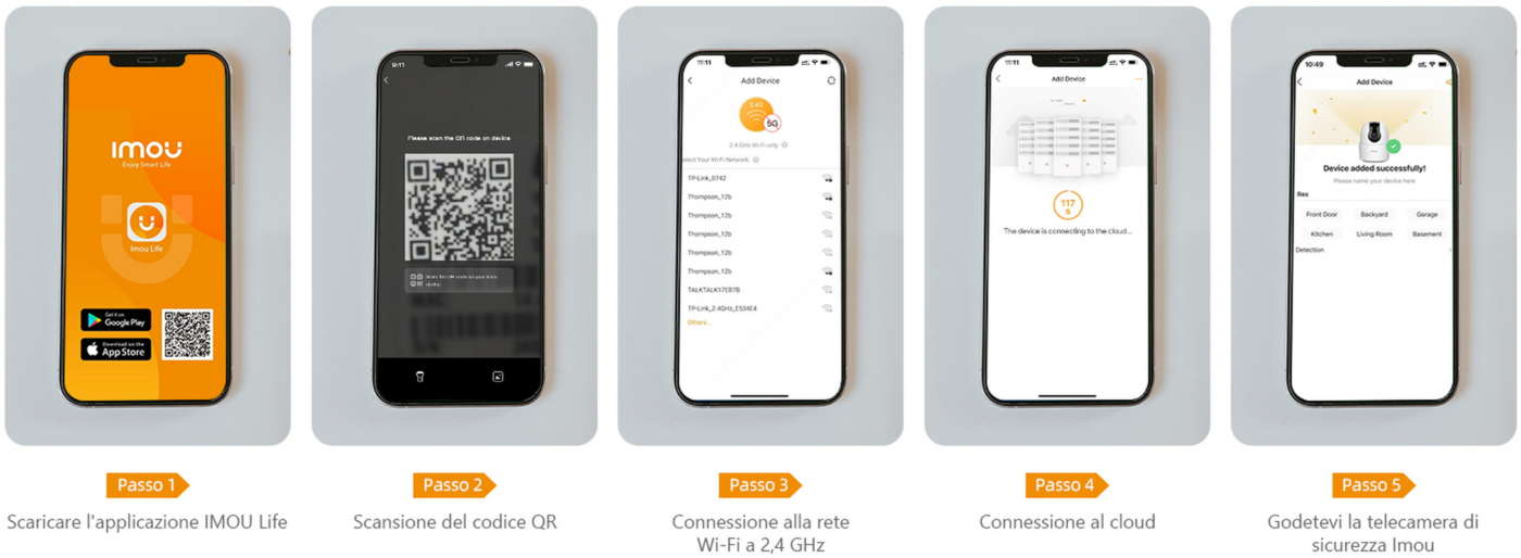 Scaricata la app e creato l’account basta cliccare sulla voce aggiungi telecamera, inquadrare il codice QR presente sulla IP Cam (etichetta) e seguire le istruzioni della app (selezione rete Wi-Fi, nome telecamera, stanza, ecc.).