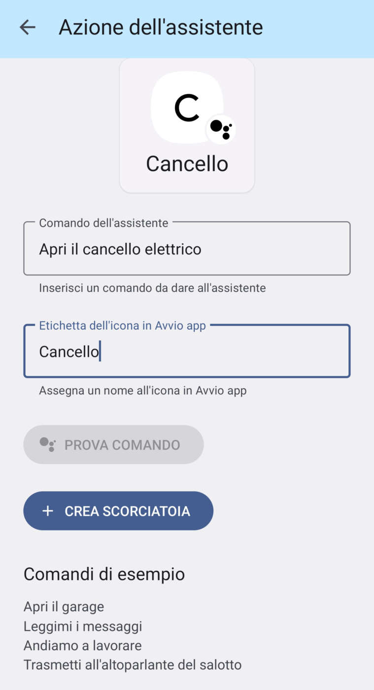 Digitate il comando da far eseguire a Google Assistant (es.: apri/accendi il cancello elettrico, accendi le luci box, ecc.), assegnate un nome all’icona in Avvio app (es.: Cancello), provate il comando e, se funziona, cliccate su + CREA SCORCIATOIA per aggiungere l’icona Cancello alle app di Android Auto.