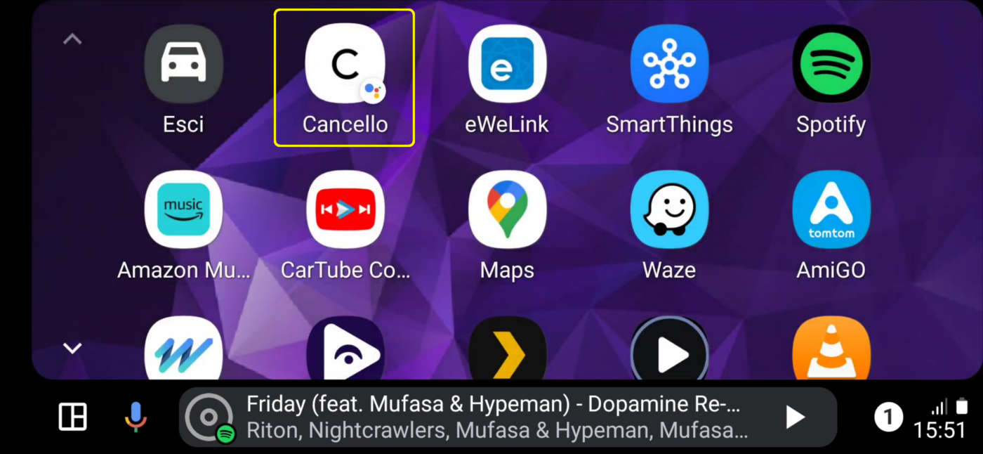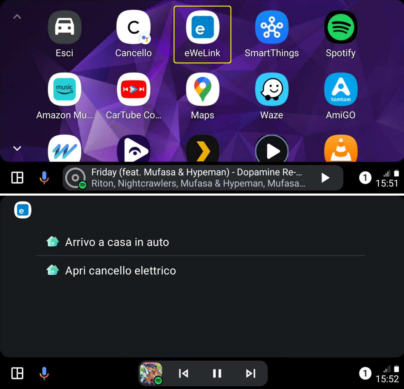 Ora collegate il vostro smartphone all’infotainment dell’auto, entrate in Android Auto oppure in CarPlay cercate eWeLink nell’elenco delle app e cliccatela per visualizzare il pannello di controllo e attivare gli scenari toccando le voci sul display.