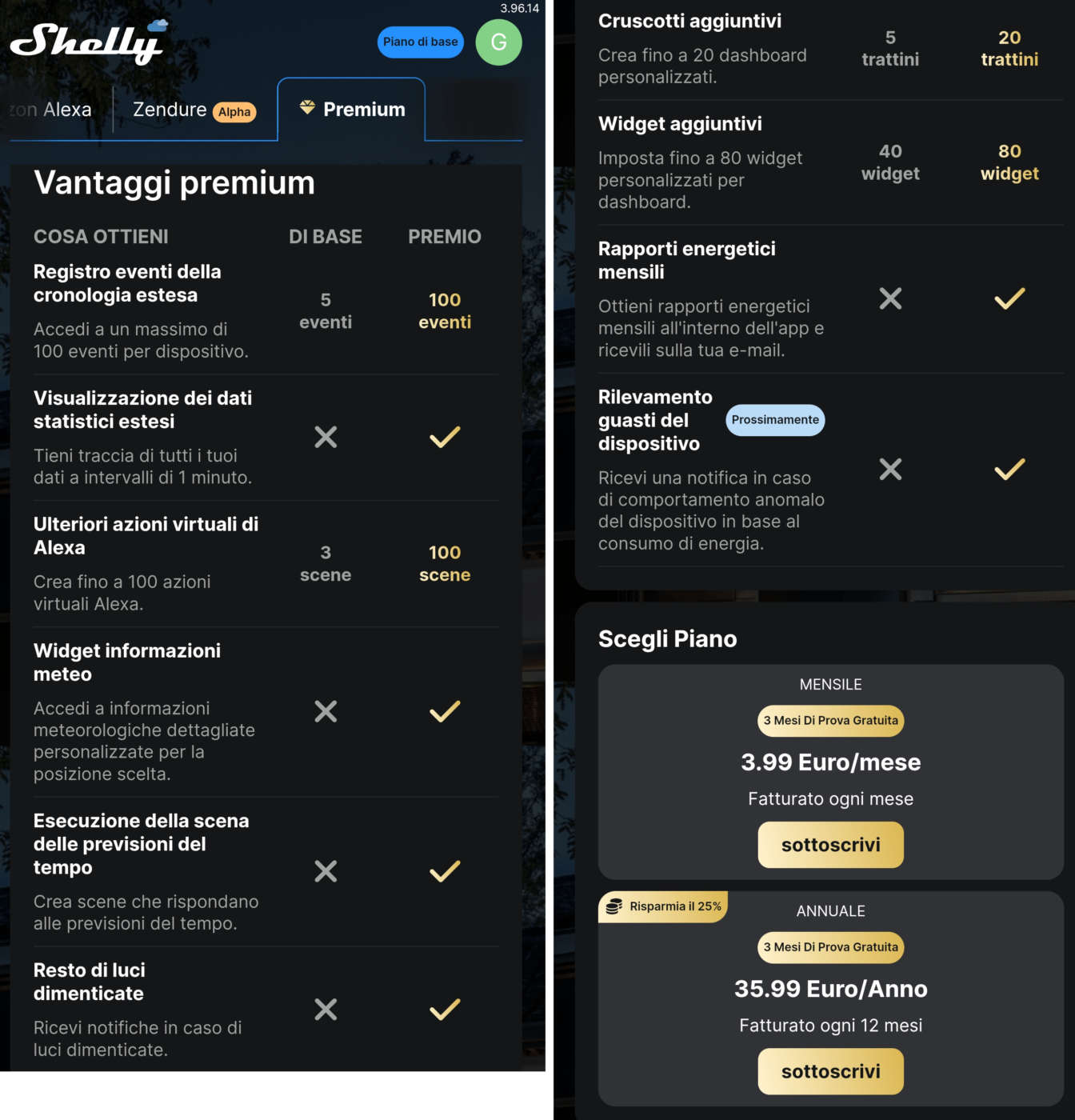 La versione premium costa 3,99 euro/mese o 35,99 euro/anno (con 3 mesi di prova gratuita) ed offre un registro eventi più completo (100 invece che 5), supporta fino a 100 scene virtuali di Alexa, la visualizzazione dei dati statistici estesi, le notifiche in caso di dispositivi dimenticati accesi, i rapporti energetici mensili e molto altro.