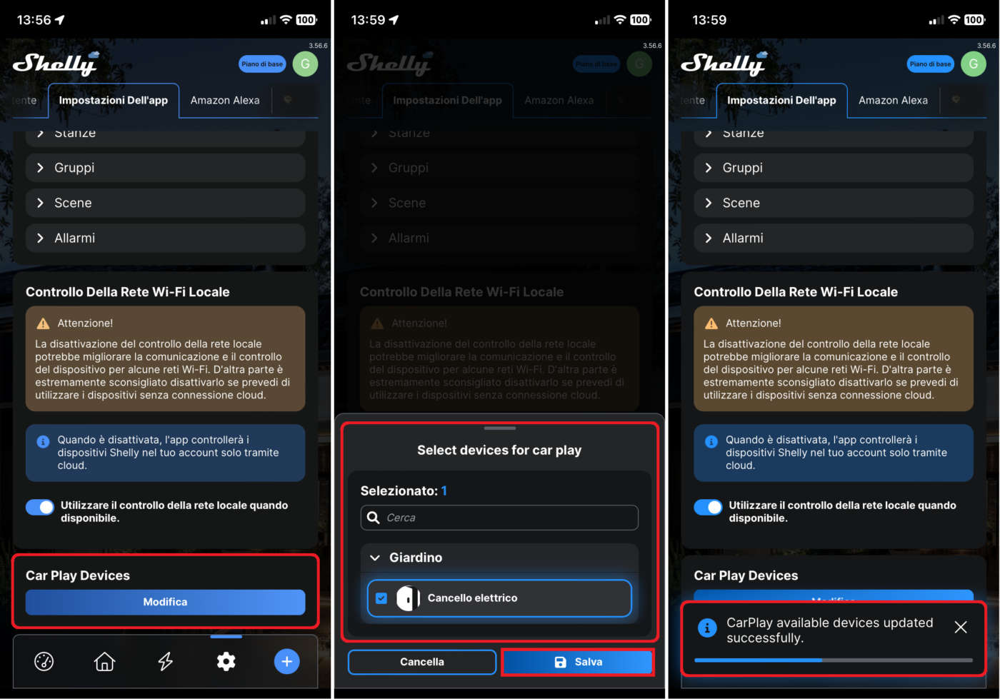 Dopo aver associato e configurato i dispositivi Shelly sulla app Android oppure iOS bisogna accedere alle impostazioni della app iOS (iPhone), scorrere in basso fino a Car Play Devices, selezionare i dispositivi da inserire nel pannello di controllo (su display touch della vettura) e cliccare su Salva.
