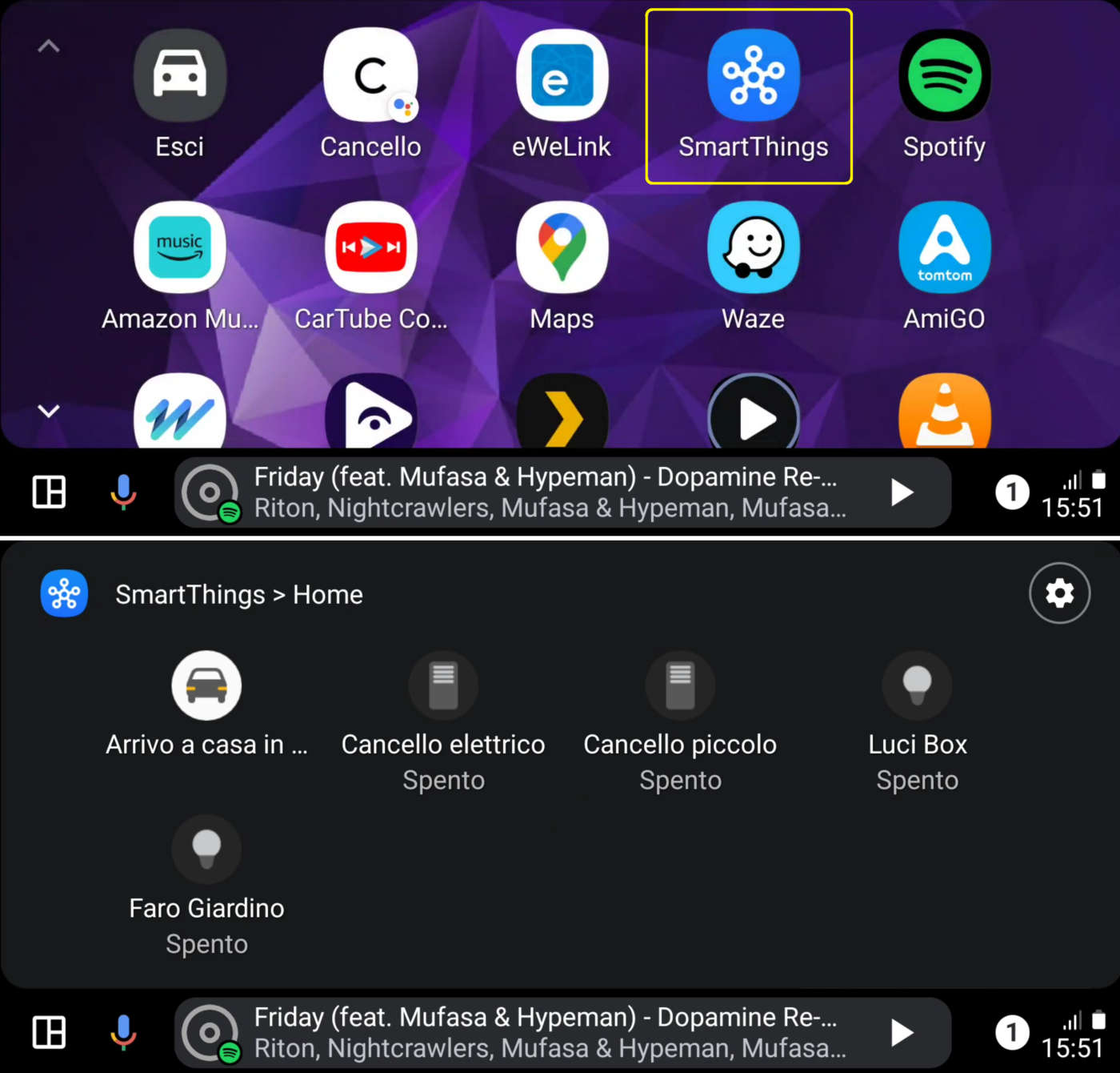 Ora collegate lo smartphone Android all’infotainment della vostra auto (con cavo USB o wireless a seconda del modello), cliccate su Android Auto, selezionate la schermata delle app (9 puntini in basso a sinistra) e cliccate su SmartThings per far apparire sul display i dispositivi e le scene appena selezionati da attivare o disattivare con un semplice tocco delle icone.