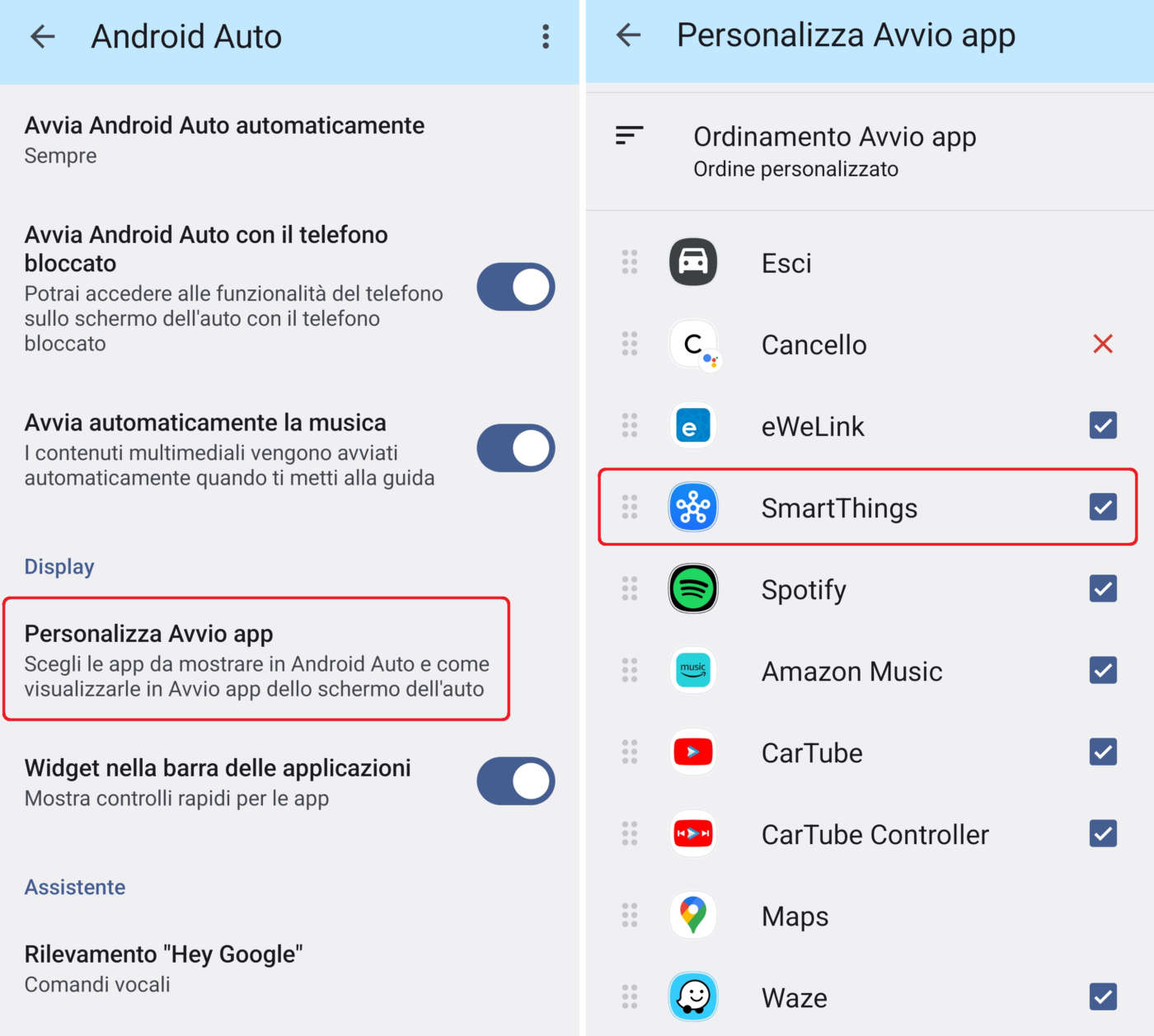 Dopo aver installato la app sul vostro smartphone Android dovete accedere alle impostazioni di Android Auto, cliccare su Personalizza Avvio app, scorrere l’elenco verso il basso, mettere la spunta su SmartThings e trascinarla verso l’alto cliccando sui puntini a sinistra in modo da posizionarla tra le prime app di Android Auto. Al termine cliccate sulla freccia in alto a sinistra.
