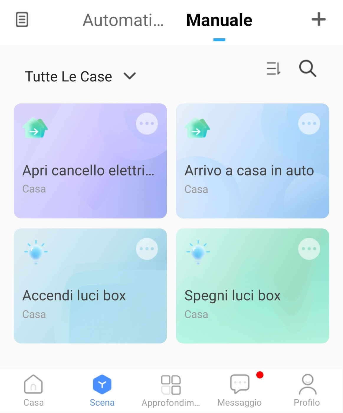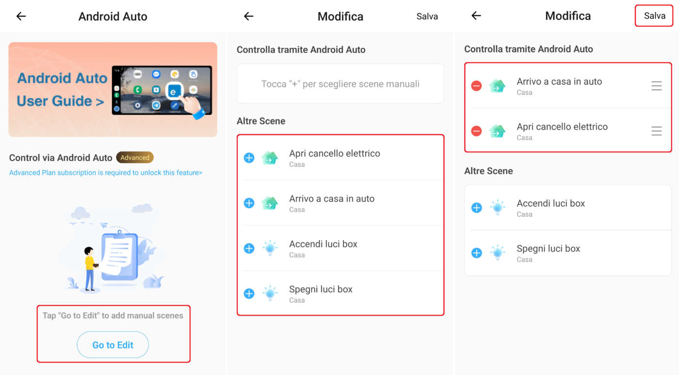 Al termine cliccate su Salva, date un nome allo scenario (es.: ritorno a casa in auto), cliccate ancora su Salva e verificate che lo scenario appena creato appaia nella schermata delle scene manuali.