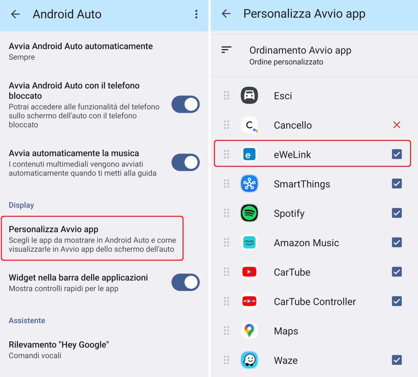 Dopo aver installato la app sullo smartphone Android dovete accedere alle impostazioni di Android Auto, cliccare su Personalizza Avvio app, scorrere l’elenco verso il basso, mettere la spunta su eWeLink e trascinarla verso l’alto cliccando sui puntini a sinistra in modo da posizionarla tra le prime app di Android Auto. Al termine cliccate sulla freccia in alto a sinistra. Stesso discorso per CarPlay come spiegato sopra.