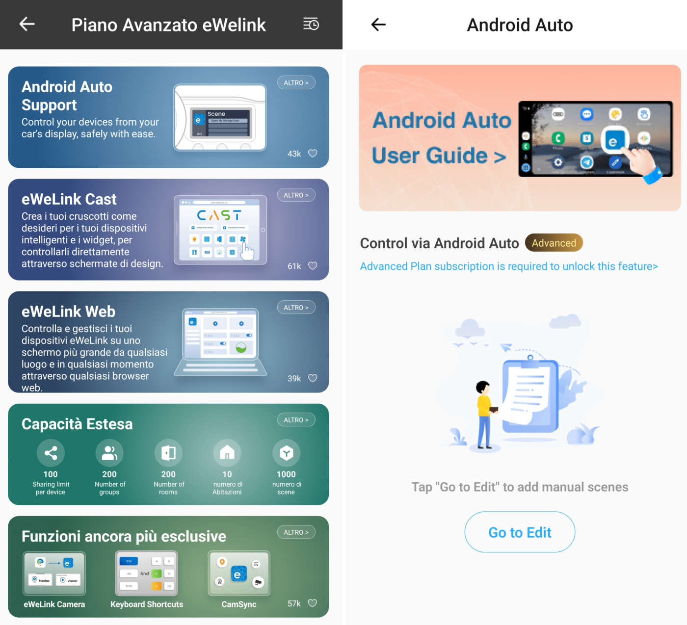 Per renderla più versatile, potente e abilitare le funzioni extra come eWeLink Web (controllo smart home da PC), Cast (cruscotti personalizzati) e il supporto Android Auto e CarPlay è necessario effettuare l’upgrade al Piano Avanzato che costa 2,09 euro/mese o 9,99 euro/anno.