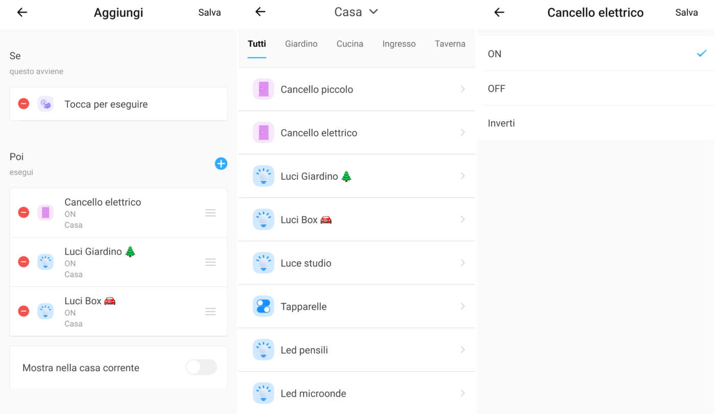 Potete scegliere un solo dispositivo (es.: cancello elettrico) ed una sola azione (On) oppure due o più dispositivi e azioni (es.: cancello elettrico, luci giardino e box).