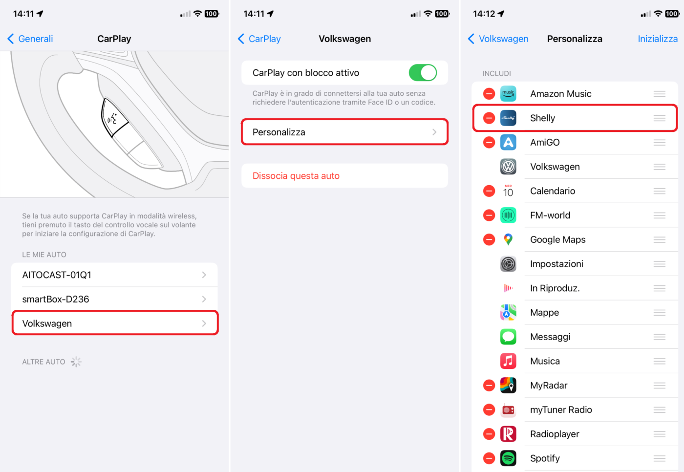 Potete anche aggiungere, rimuovere o riorganizzare le app sempre attraverso le impostazioni di CarPlay su iPhone (Impostazioni > Generali > CarPlay > nome vettura > Personalizza) cliccando su + (aggiungi), – (elimina) o toccando e trascinando le app elencate una per volta per cambiare posizione/schermata.