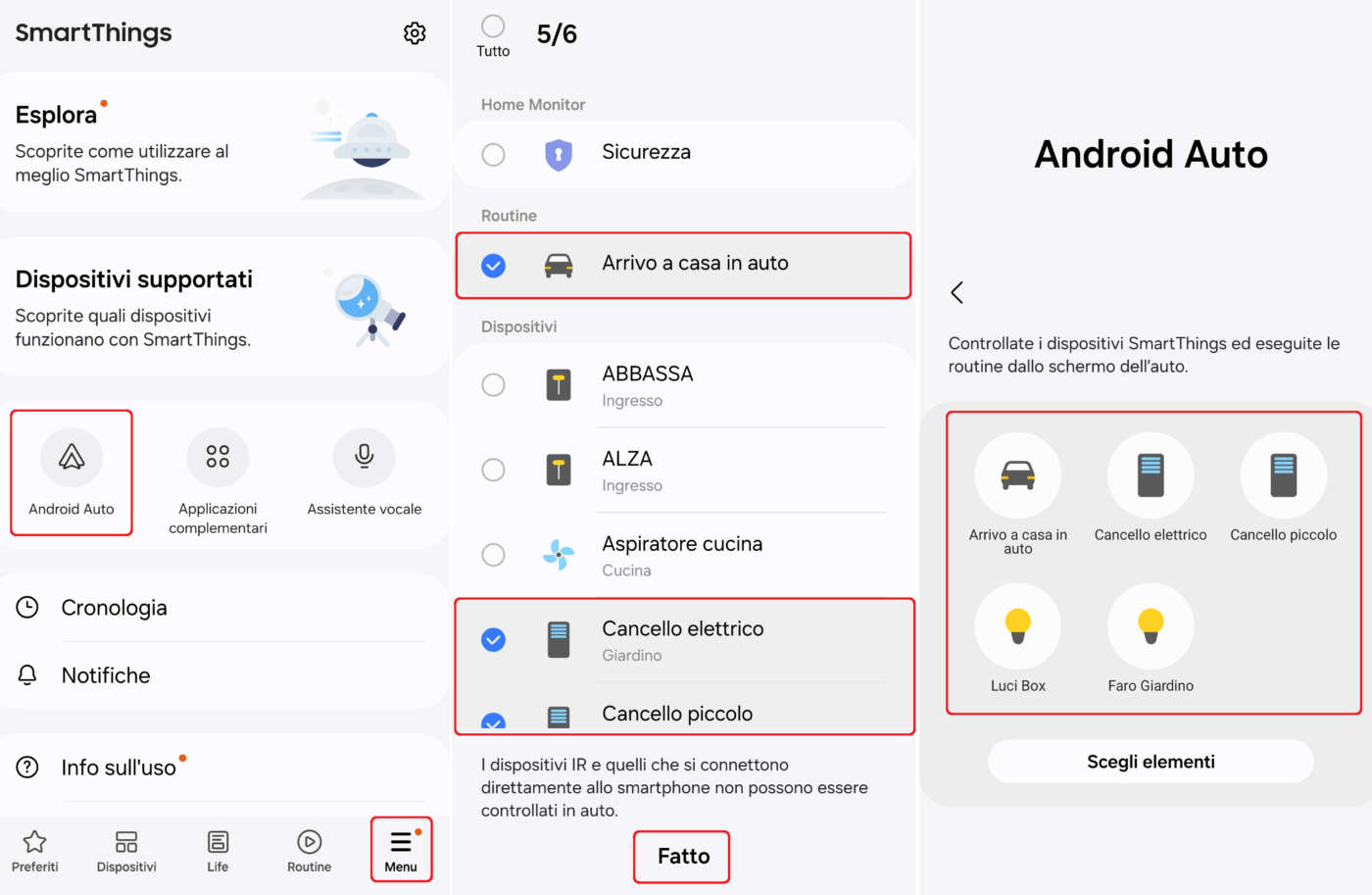Cliccate le tre linee nella barra inferiore (Menu), poi l’icona Android Auto al centro, cliccate su Scegli elementi e mettete la spunta sui dispositivi e gli scenari che volete far comparire sul display touch della vettura (massimo 6). Al termine cliccate su Fatto.