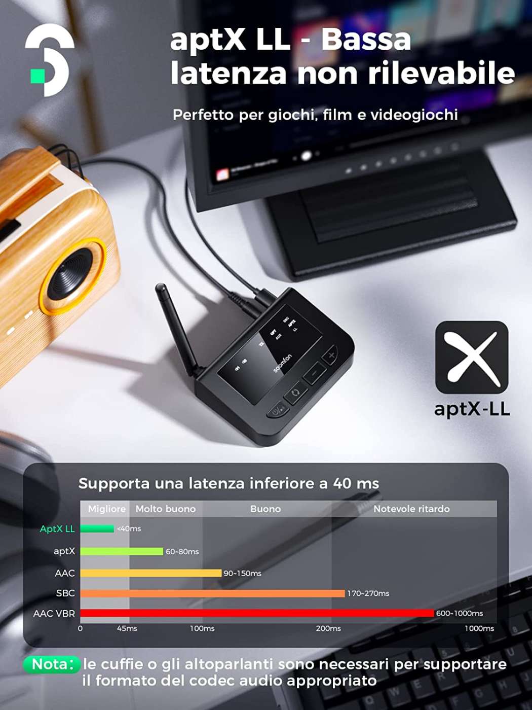 Supporta la doppia modalità di ricezione e trasmissione, la versione più recente della tecnologia Bluetooth (5.2) e il codec aptX LL a bassa latenza per un audio Hi-Fi senza ritardi.