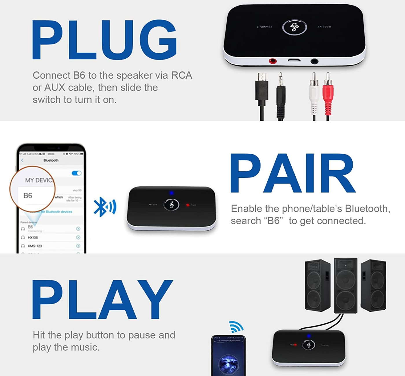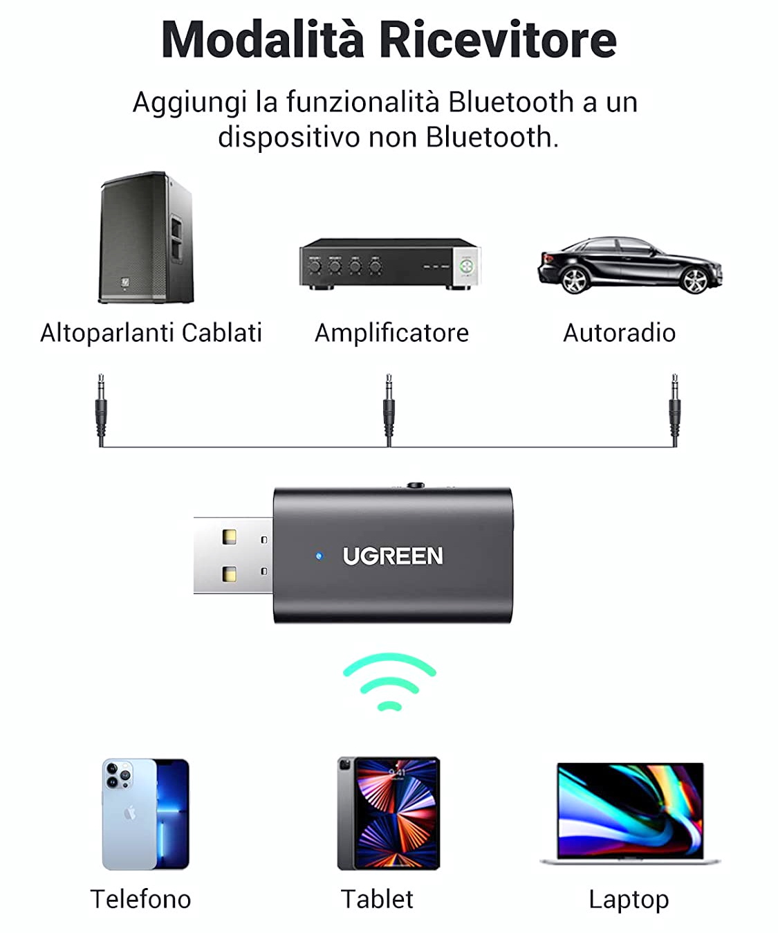 Molti adattatori supportano la modalità “ricevitore” che serve a ricevere un segnale audio Bluetooth e convertirlo in un segnale analogico/digitale cablato (presa audio mini-jack, RCA/Cinch o SPDIF).