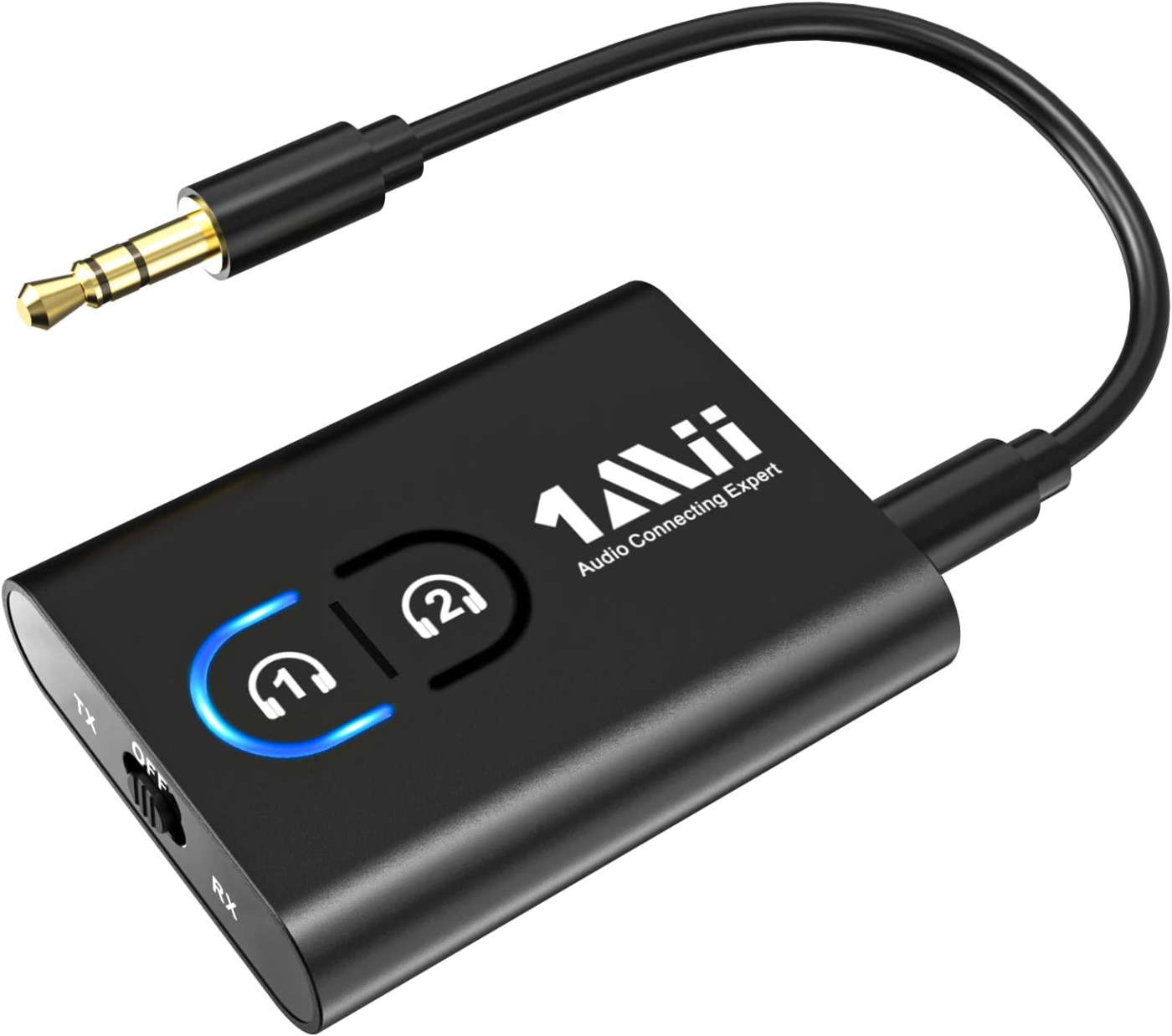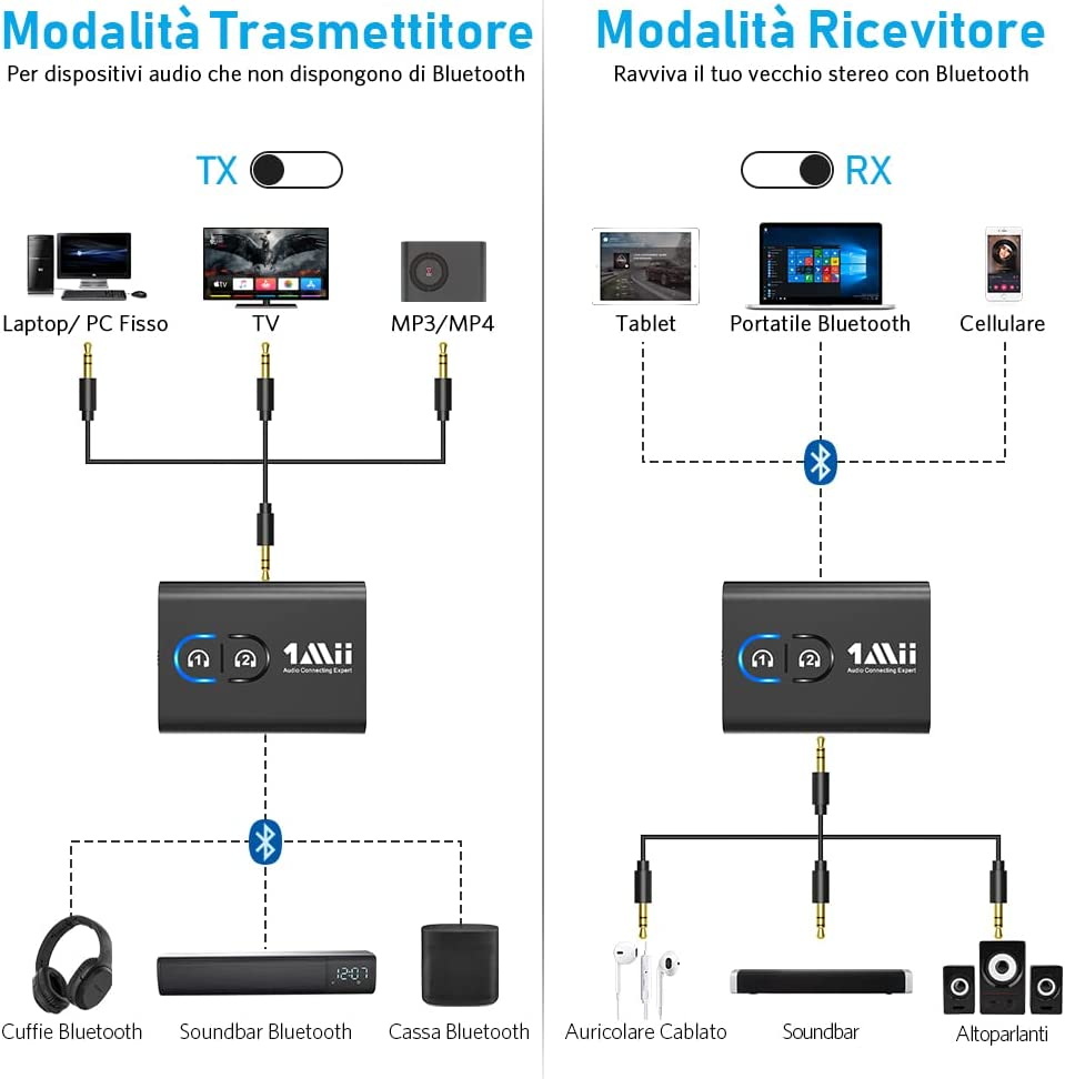 Supporta sia la ricezione che la trasmissione dei segnali audio Bluetooth in versione 5.1 (o precedente) e può ricevere lo streaming audio BT su due dispositivi diversi e in contemporanea (es.: smartphone Android e iPhone oppure Tv e smartphone) per trasmetterli via cavo (presa mini-jack 3,5 mm con cavo stereo in dotazione).