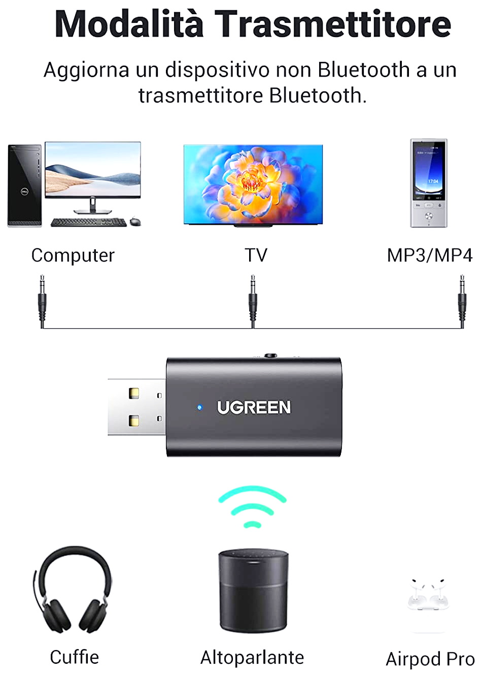 Alcuni modelli supportano invece solo la modalità “trasmettitore” che svolge la funzione opposta: ricevono un segnale audio analogico/digitale via cavo e lo trasformano in un flusso digitale Bluetooth.