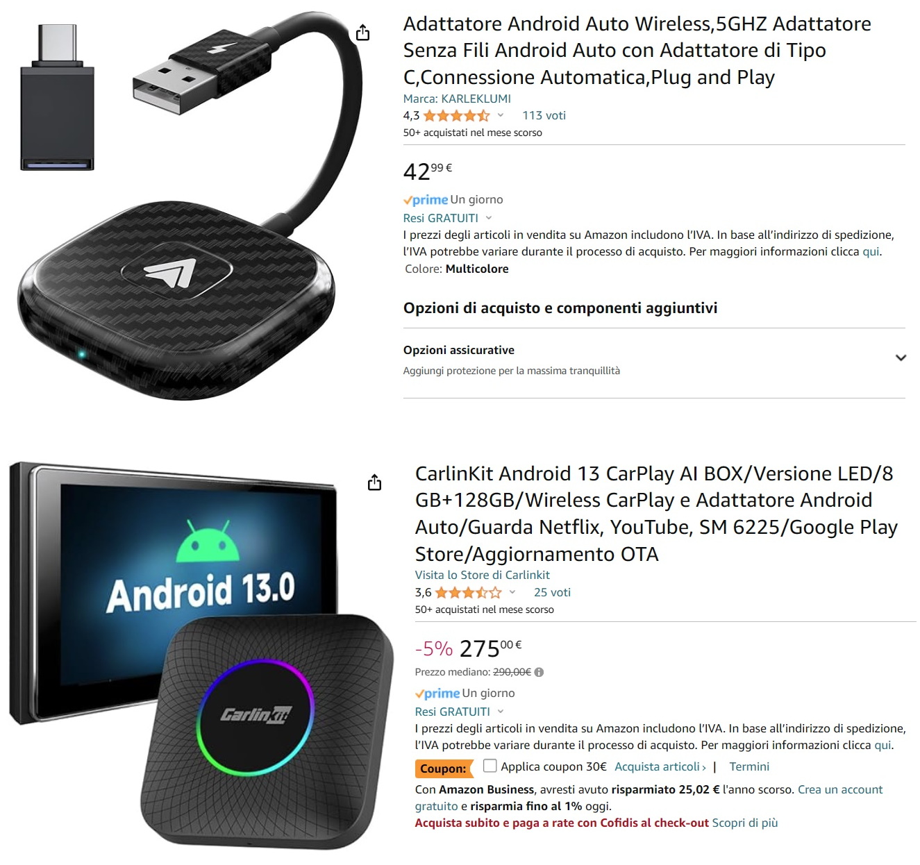 Le differenze di funzionalità, componentistica e dotazioni tra adattatori wireless e AI Box si riflettono inevitabilmente sul costo finale. Mentre i primi hanno un prezzo che varia tra 30 e 80 euro, i secondi superano abbondantemente i 100-150 euro per arrivare a 250-300 nei modelli top di gamma.
