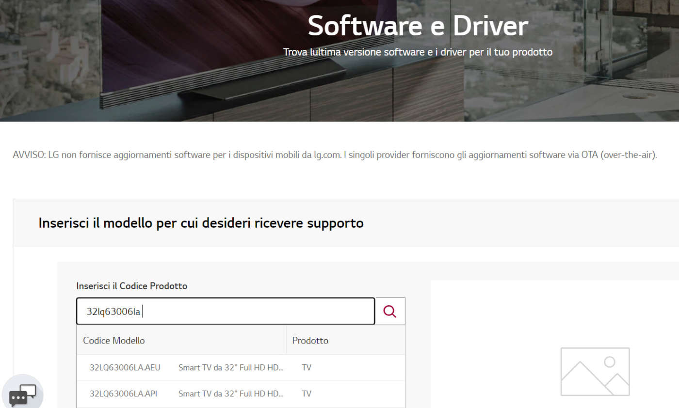 Cercate oppure inserite il codice modello del vostro televisore e scorrete la pagina fino a trovare i software compatibili.